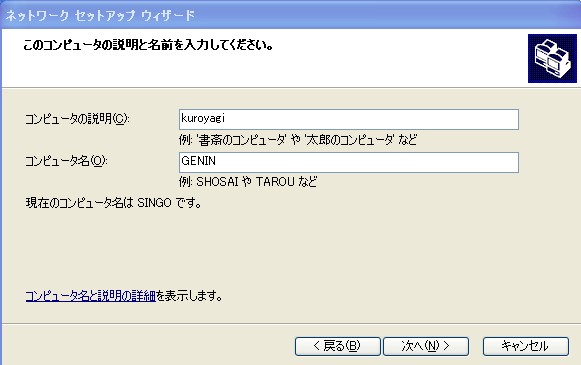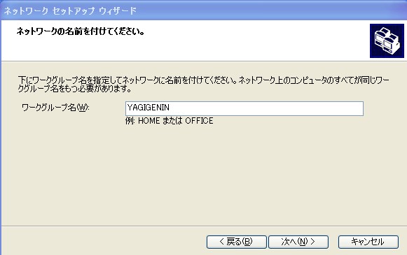 何か適当な名前をつけたら次へ/を押します。この時、3台のパソコンなら、それぞれ違う名前にしておかないと